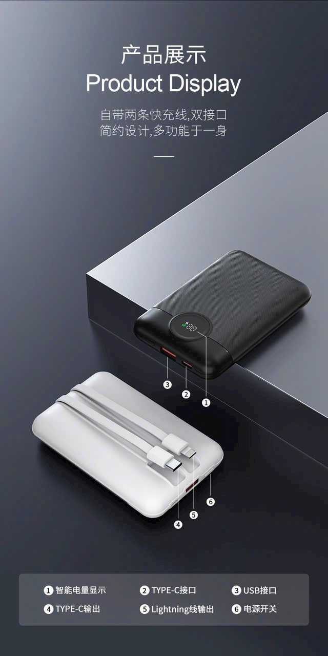 Mẫu pin sạc dự phòng 3 trong 1 với thiết kế tích hợp 2 dây sạc sẵn: cáp Type-C và cáp Lightning, cực kỳ tiện dụng cho người dùng iPhone, iPad và Android.